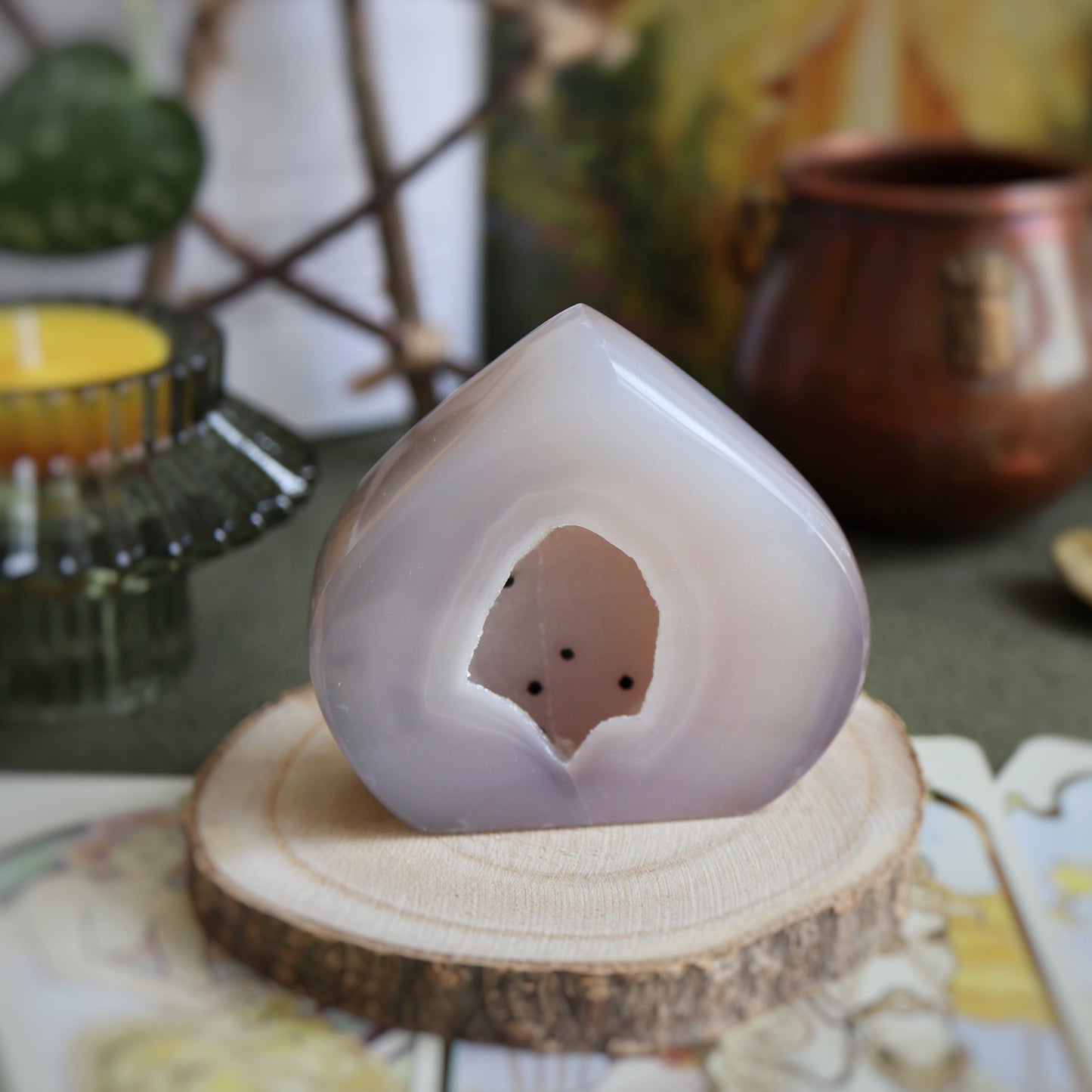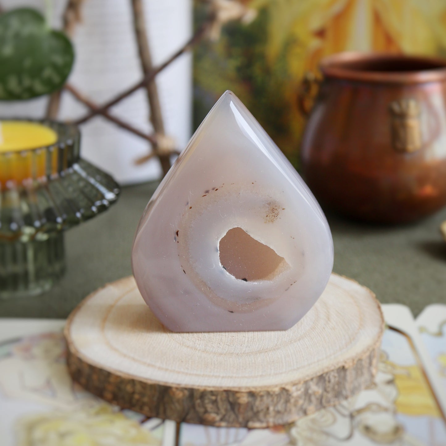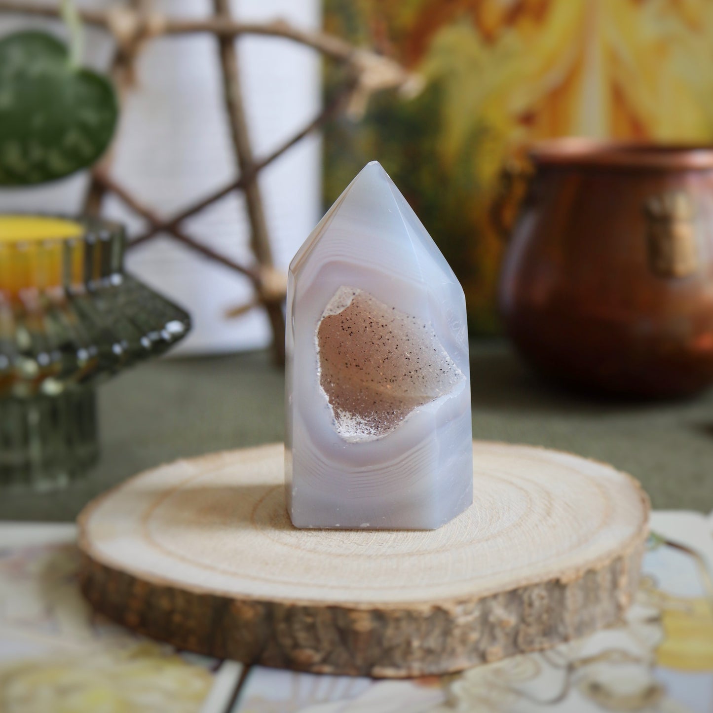 L'agate cristallisée apporte calme et sérénité dans les lieux où on la place. Travailler avec elle peut permettre d'aiguiser les sens. Certaines présentent des taches blanches, on appelle cela des yeux. Dans ce cas, bonus surprise : cette spécificité te permettra d'avoir une meilleure vision des situations et de faire tes propres choix sans avoir besoin des autres. N'en abuse pas, si tu es déjà très indépendant.e (les signes d'air, on vous voit) !
