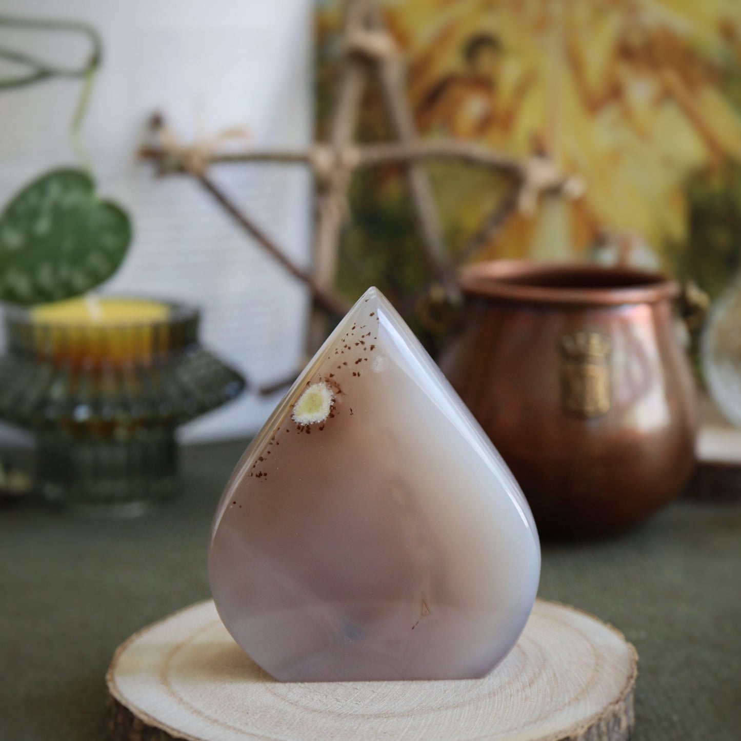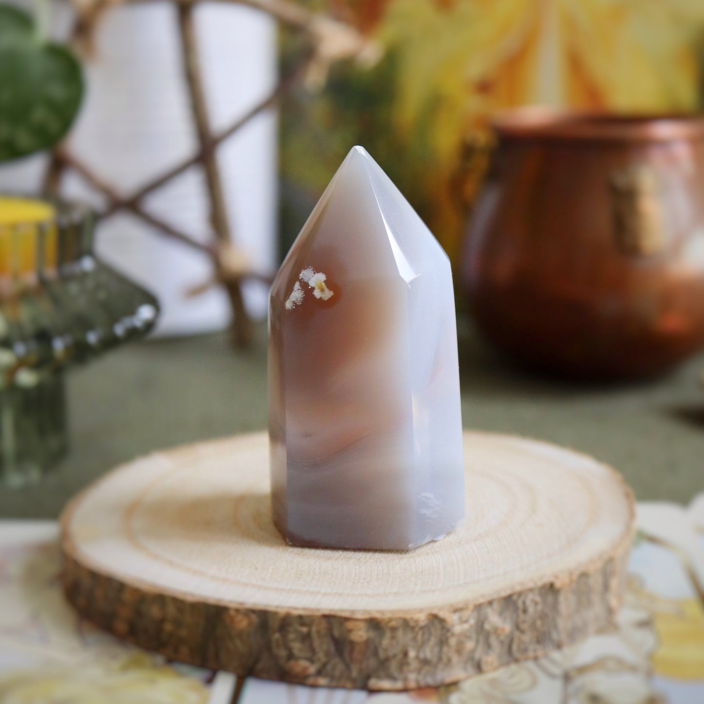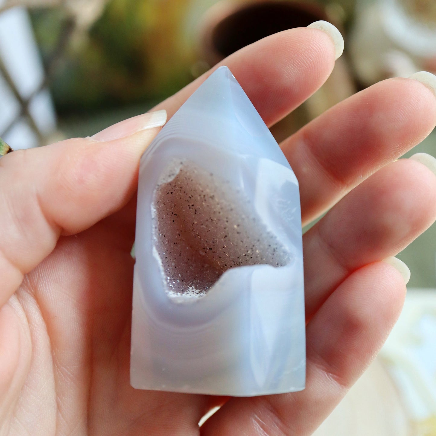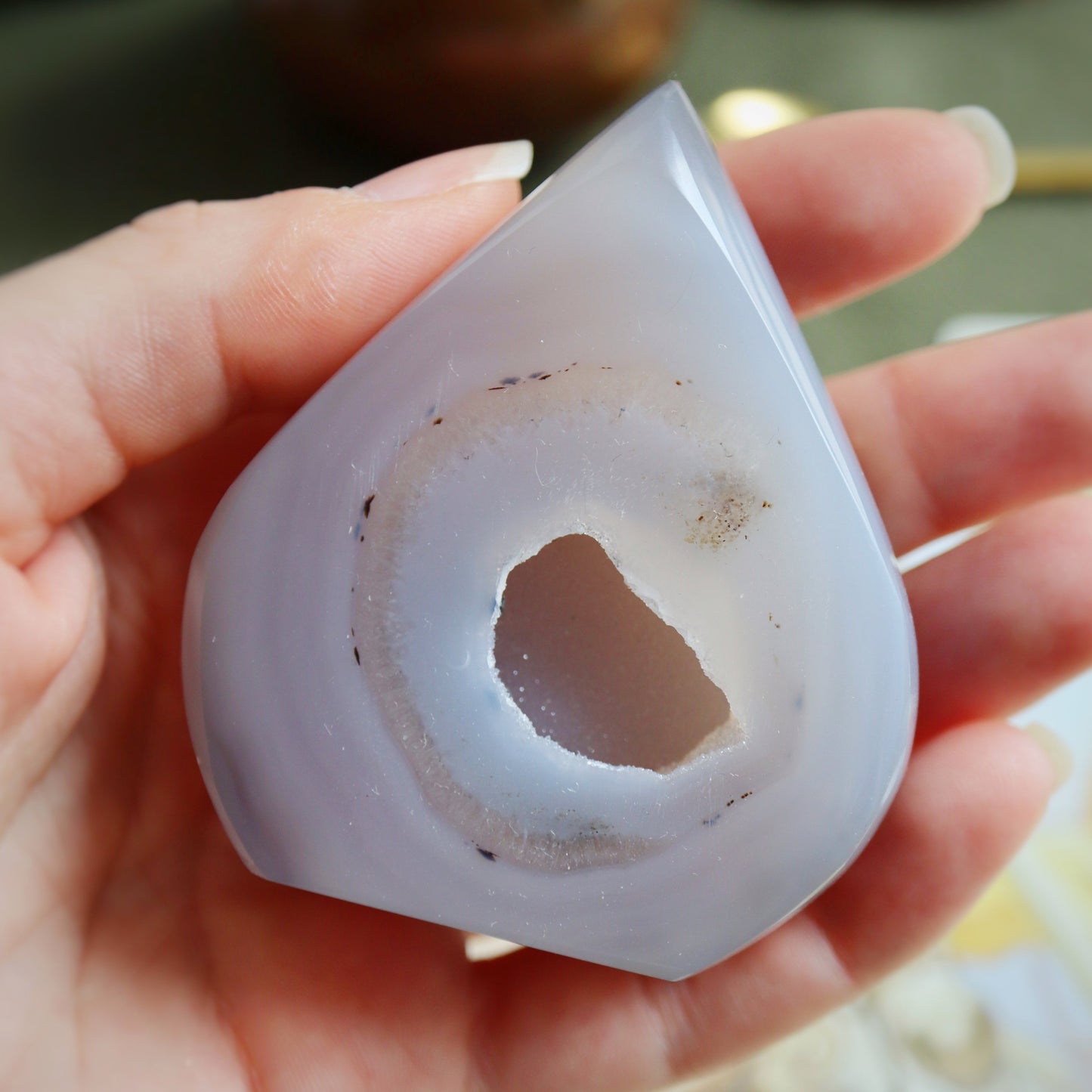 L'agate cristallisée apporte calme et sérénité dans les lieux où on la place. Travailler avec elle peut permettre d'aiguiser les sens. Certaines présentent des taches blanches, on appelle cela des yeux. Dans ce cas, bonus surprise : cette spécificité te permettra d'avoir une meilleure vision des situations et de faire tes propres choix sans avoir besoin des autres. N'en abuse pas, si tu es déjà très indépendant.e (les signes d'air, on vous voit) !