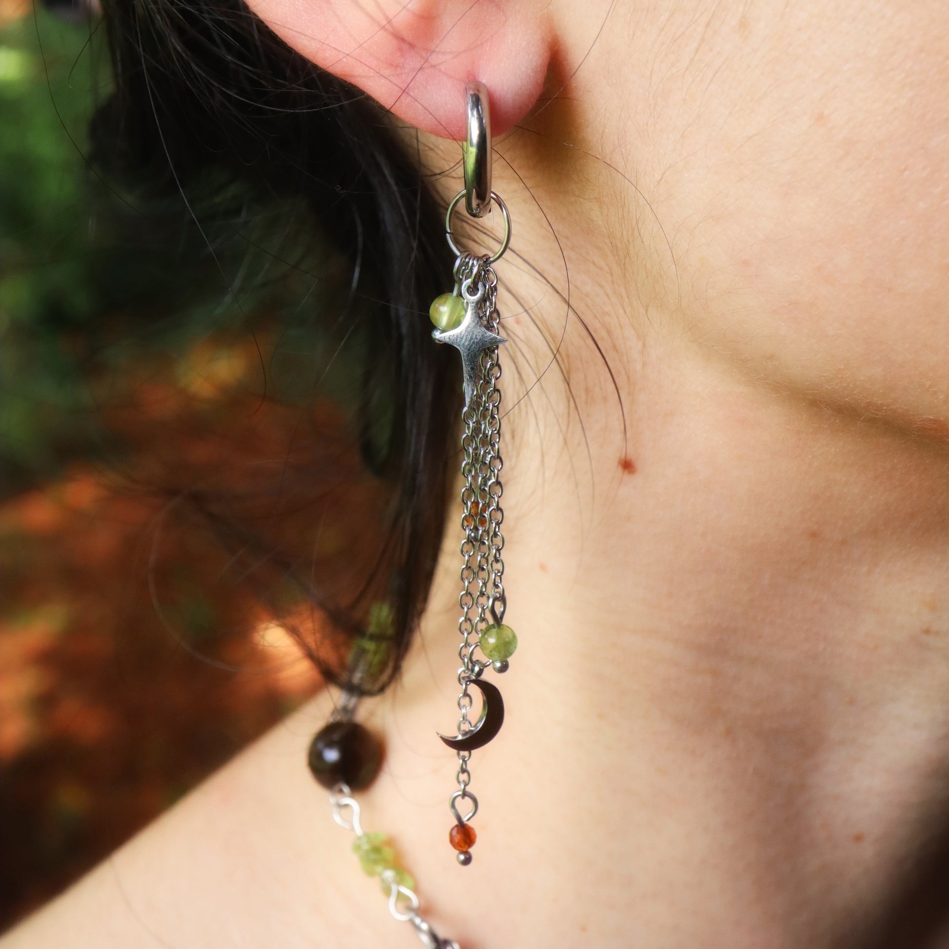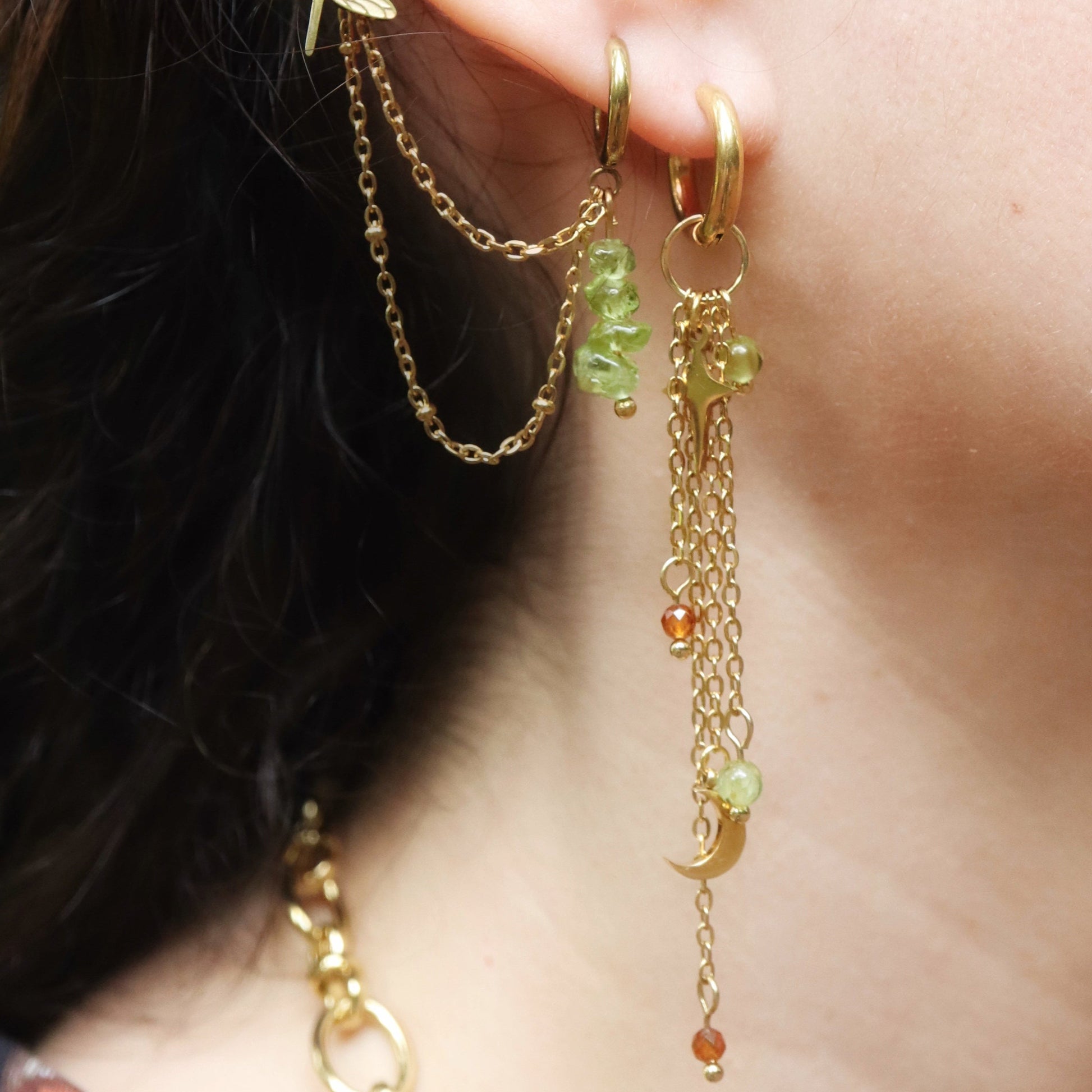 It's raining spells! Si toi aussi tu es prête à faire pleuvoir les sorts, alors tu es faite pour cette mono-boucle aux vertus singulières. Sa cascade de perles aux couleurs automnales et son petit croissant de lune t'accompagneront aux réunions de ton coven, dans tes rituels perso ou simplement au quotidien pour manifester de nouvelles opportunités...