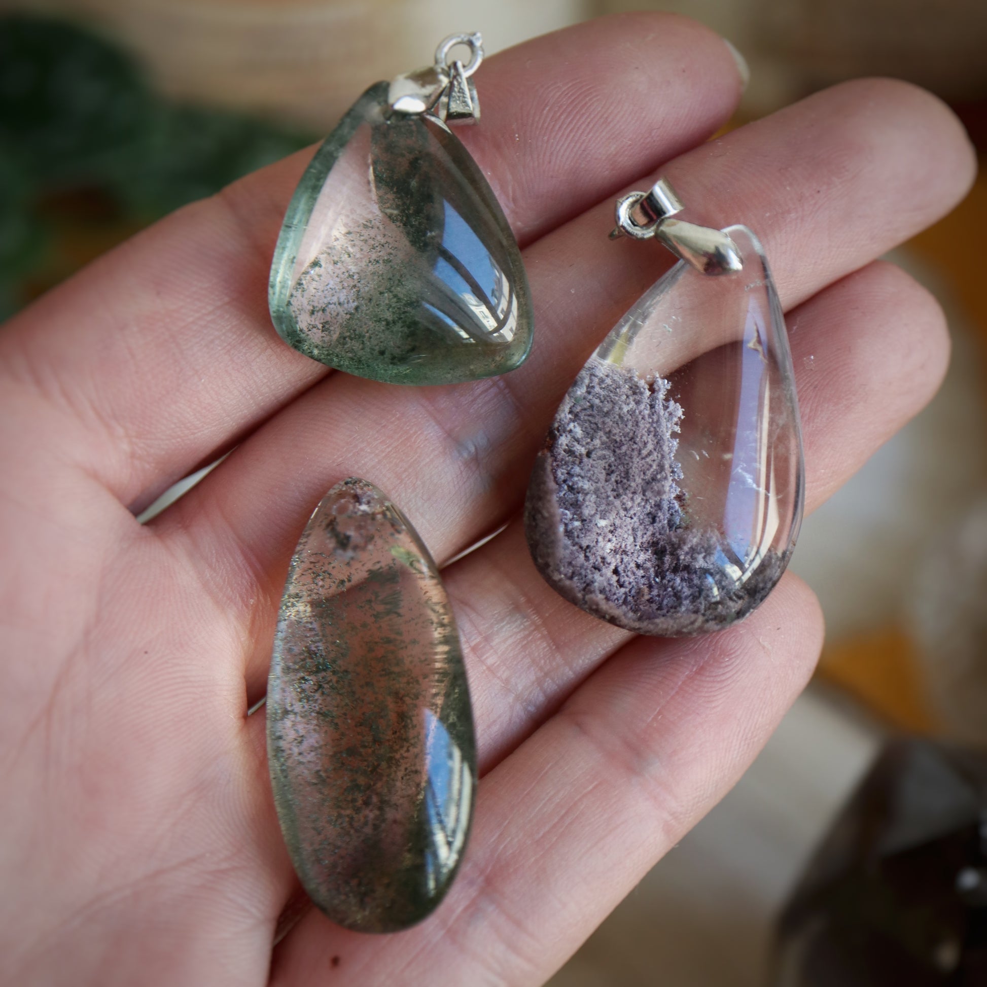 Pendentif en lodolite percée de face. Lien avec le spirituel, équilibre.